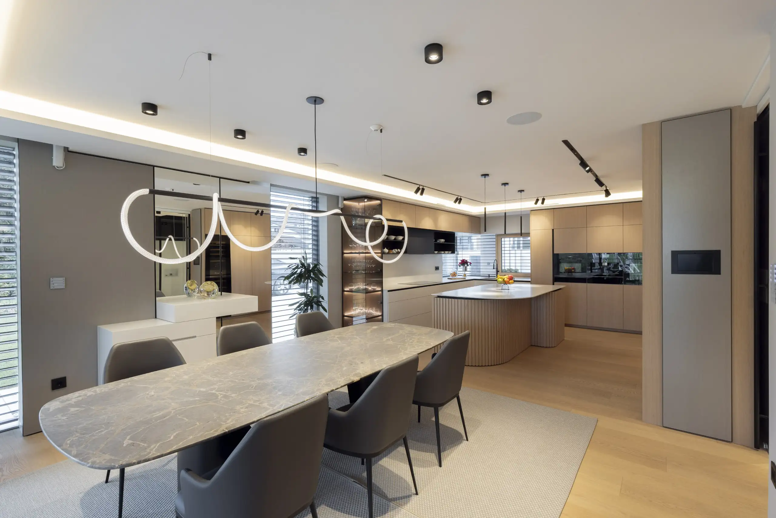 Der zentrale Bereich der Küche ist eingenommen von einer großen Kücheninsel mit abgerundeten, halbkreisförmigen Enden und Holzlatten, die dem Raum eine weiche Note verleihen.