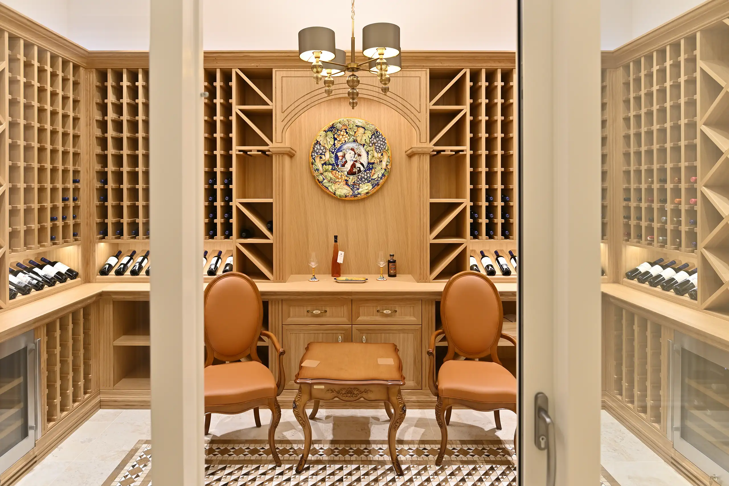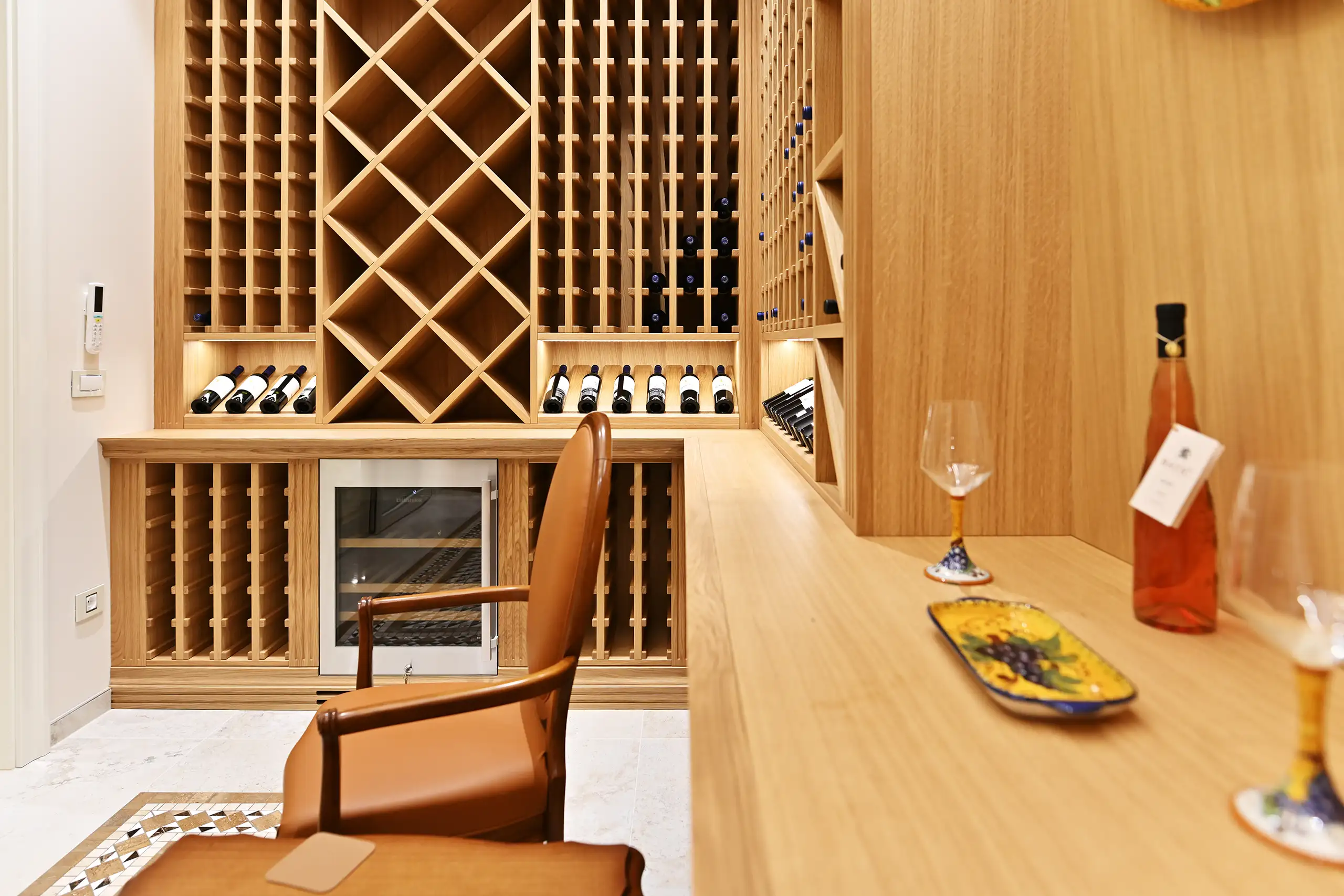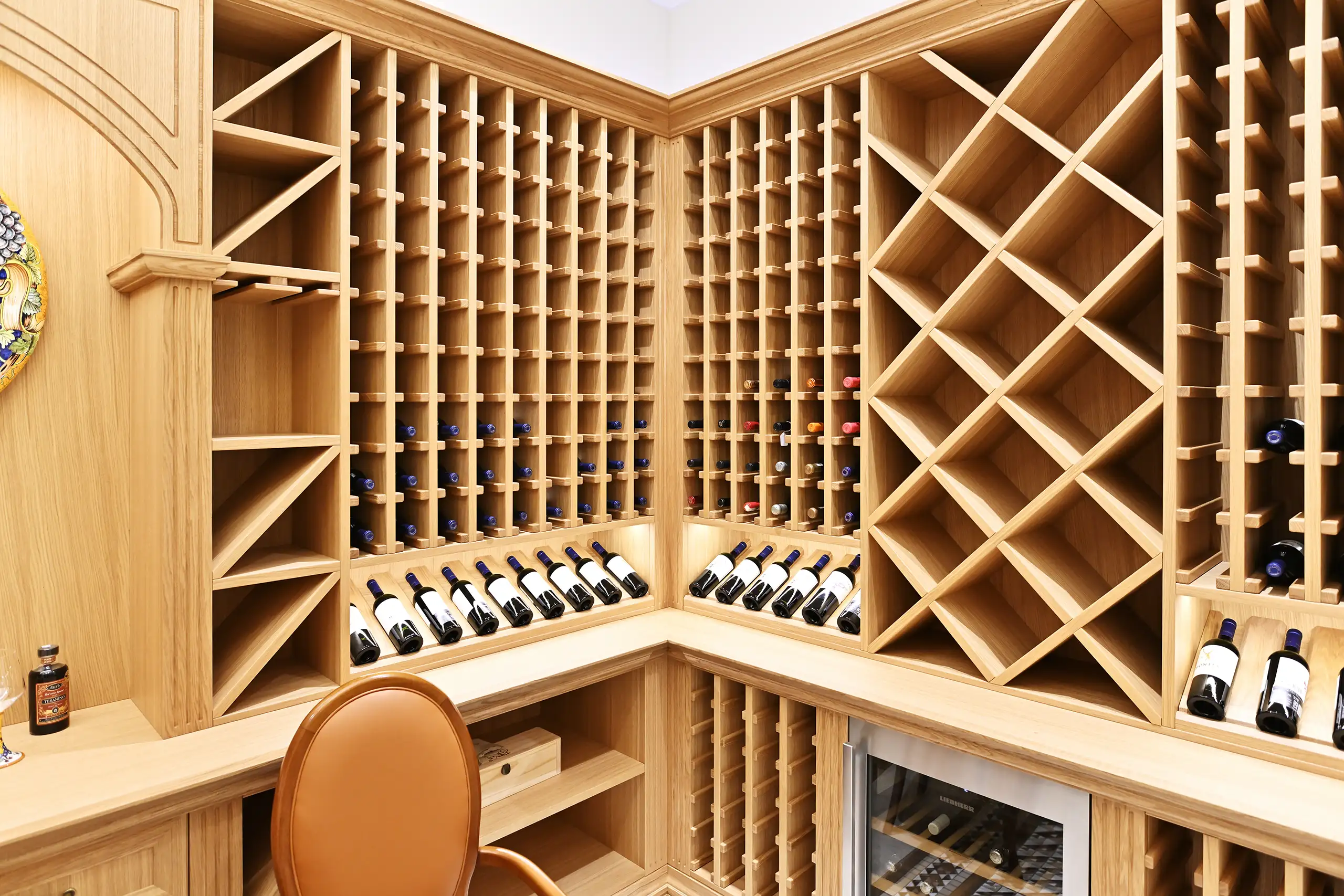 Eine Besonderheit der Villa ist der außergewöhnlich gestaltete Weinraum aus massiver Eiche. Jedes Regal ist das Ergebnis sorgfältiger Planung und Ausführung mit dem Ziel, Weinschätze optimal zu lagern und zu präsentieren.